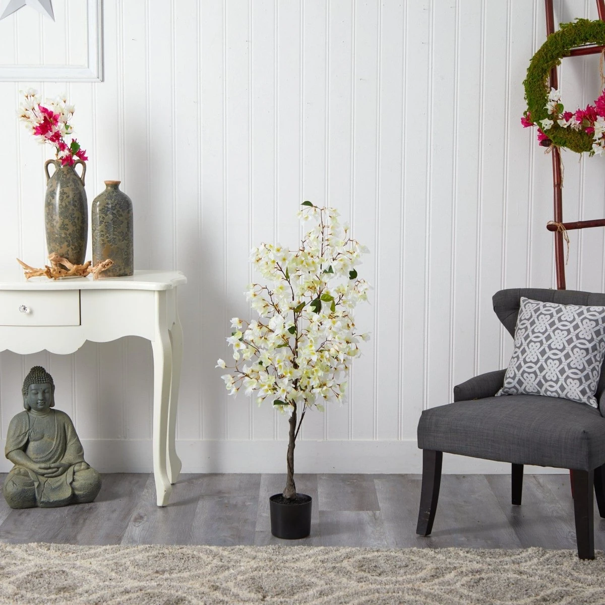 Bring a burst of color and life into your home with this 4’ Bougainvillea Artificial Tree. Featuring vivid pink flowers that cascade from a realistic brown trunk, this lifelike tree is inspired by nature and designed to brighten any space. Standing at 4 feet tall in a sturdy nursery planter, it’s a perfect statement piece for rooms that need a touch of elegance and vibrancy. Approved by horticulturists for its authentic appearance, this artificial tree effortlessly enhances spaces like bathrooms, kitchens, or home offices—anywhere that could use a little extra bloom.