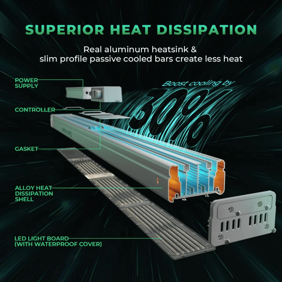 Operating at just 300W, the SP 3000 replaces higher-wattage systems while maintaining low heat output and energy consumption. Its thick aluminum heat sink efficiently dissipates heat, ensuring a cooler and safer grow space.